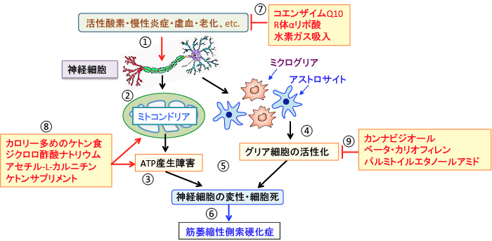 図:活性酸素や慢性炎症や虚血や老化などによって神経細胞が傷害されると(①)、ミトコンドリアでのATP産生が障害され(②)、神経細胞の変性や細胞死が誘導される(③)。一方、炎症などの刺激によってグリア細胞が活性化されると(④)、神経細胞の変性・細胞死が誘導される(⑤)。神経細胞の変性や細胞死は筋萎縮性側索硬化症(ALS)などの神経変性疾患を引き起こす(⑥)。コエンザイムQ10やR体αリポ酸や水素ガス吸入は抗酸化作用によって神経傷害を抑制できる(⑦)。カロリーが高めのケトン食、ジクロロ酢酸、アセチル-L-カルニチン、ケトンサプリメントなどでミトコンドリアの働きを高めてATP産生を増やし(⑧)、グリア細胞の活性化を抑制するカンビジオール、ベータ・カリオフィレン、パルミトイルエタノールアミド(⑨)などを併用すると、筋萎縮性側索硬化症の進行の抑制に効果が期待できる。