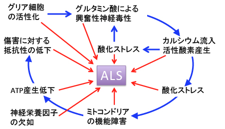 病理学的には運動ニューロンの選択的な変性・消失がALS発症の原因ですが、「なぜ運動ニューロンが選択的に脱落するのか」というメカニズムに関してはまだ不明です。 いろんな仮説が報告されています。