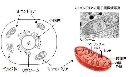 ミトコンドリアは酸素を使ってグルコース(ブドウ糖)や脂肪酸やアミノ酸を燃焼してエネルギーのATP(アデノシン3リン酸)を産生する働きがあります。つまり、細胞の発電所のような器官です。