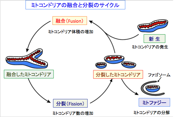 ダメージを受けて機能異常を起こしたミトコンドリアはミトコンドリアに特異的なオートファジーによる除去システムのミトファジー(mitophagy)によって分解され、新しいミトコンドリアがミトコンドリア新生(mitochondrial biogenesis)によって作られます。 このようなミトファジーとミトコンドリア新生のバランスによってミトコンドリアの品質が決まります。これは、ミトコンドリアの品質を良くすることも可能であることを意味します。