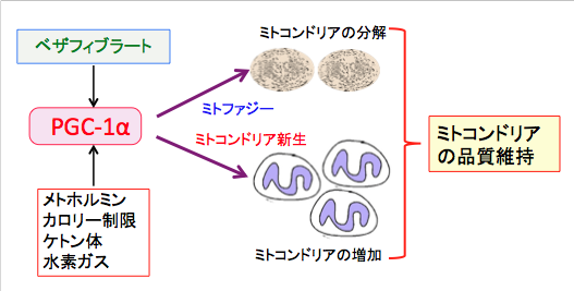 図:PPARの汎アゴニストのベザフィブラートやAMP活性化プロテインキナーゼやサーチュイン1を活性化するメトホルミン、カロリー制限、ケトン体、水素ガスはPGC-1α(ペルオキシソーム増殖因子活性化受容体γコアクチベーター1α)を活性化する。PGC-1αはミトコンドリア新生を亢進して新しいミトコンドリアを増やし、ミトファジーを亢進して異常なミトコンドリアの分解を亢進する。その結果、ミトコンドリアの品質を良好に維持する。
