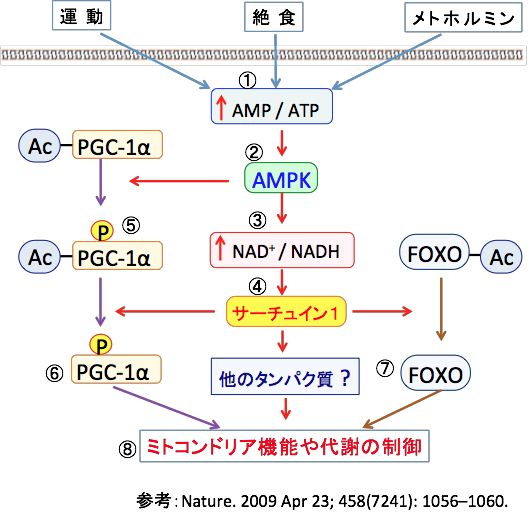 図:運動や絶食やメトホルミンは筋肉細胞内のAMP/ATP比を上昇し(①)、AMP依存性プロテインキナーゼ(AMPK)を活性化する(②)。AMPK活性化はNAD+/NADH比を高め(③)、サーチュイン1(SIRT1)を活性化する(④)。AMPKはPGC-1α(Peroxisome Proliferator- activated receptor gamma coactivator-1α:ペルオキシソーム増殖因子活性化受容体γコアクチベーター1α)をリン酸化し(⑤)、さらにSIRT1で脱アセチル化されて活性化する(⑥)。サーチュイン1はFOXOファミリーなどの転写因子を脱アセチル化して活性化する(⑦)。活性化したPGC-1αやFOXOはミトコンドリア機能や代謝を制御する。(図中のPはリン酸化、Acはアセチル基を示す)