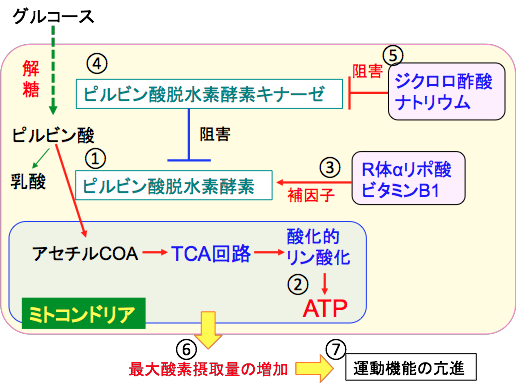 図:グルコースが解糖系で代謝されてピルビン酸に変換された後、ピルビン酸脱水素酵素によってミトコンドリア内でアセチルCoAに変換される(①)。アセチルCoAはミトコンドリア内でTCA回路と呼吸酵素複合体における酸化的リン酸化によってATPが産生される(②)。R体αリポ酸とビタミンB1はピルビン酸脱水素酵素の活性に必要な補因子(③)。ピルビン酸脱水素酵素はピルビン酸脱水素酵素キナーゼによってリン酸化されることによって活性が阻害されている(④)。ジクロロ酢酸ナトリウムはピルビン酸脱水素酵素キナーゼを阻害する作用があり、その結果ピルビン酸脱水素酵素を活性化する(⑤)。これらの組合せは、筋肉と心臓のエネルギー産生を高めることができ、最大酸素摂取量が増加し(⑥)、持久力など運動のパフォーマンスを高めることができる(⑦)。