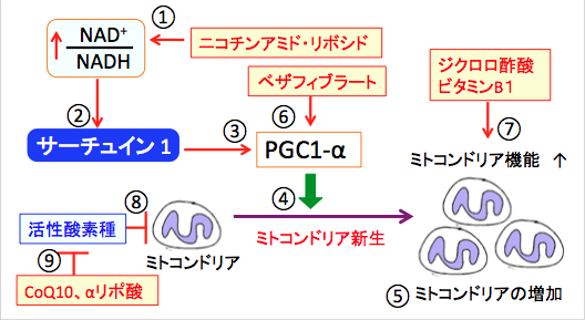 図:ニコチンアミド・アデニン・ジヌクレオチド(NAD+)の前駆体のニコチンアミド・リボシドの補充はNAD+/NADH比を高め(①)、サーチュイン1を活性化する(②)。サーチュイン1はPGC-1α(PPARγコアクチベーター1α)を活性化し(③)、PGC-1αはミトコンドリア新生を亢進して(④)、細胞内のミトコンドリアの数と量を増やす(⑤)。PPAR(ペルオキシソーム増殖因子活性化受容体)の汎アゴニスト(受容体に結合して活性化する物質)であるベザフィブラートは、直接あるいはPPARを介してPGC-1αを活性化する(⑥)。ジクロロ酢酸とビタミンB1はピルビン酸脱水素酵素を活性化する機序でミトコンドリア機能(物質代謝とエネルギー産生)を亢進する(⑦)。ミトコンドリアは活性酸素種によってダメージを受けている(⑧)。抗酸化作用のあるCoQ10、αリポ酸は酸化ストレスを軽減して、ミトコンドリアのダメージを阻止する(⑨)。したがって、ニコチンアミド・リボシド+ジクロロ酢酸+ビタミンB1+ベザフィブラート+CoQ10+αリポ酸の組合せは、老化に伴う諸臓器機能の低下の改善や、ミトコンドリアの機能低下による様々な疾患(筋萎縮性側索硬化症など)の治療に試してみる価値がある。
