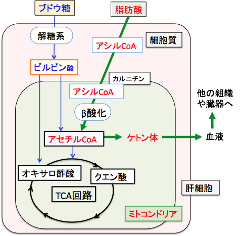 脂肪酸の酸化で作られるアセチルCoAの多くはTCA回路(クエン酸回路)に入りますが、絶食時などブドウ糖が少ない状況ではアセチルCoAをTCA回路で処理する時に必要なオキサロ酢酸ができないため、TCA回路が十分に回りません。そのためTCA回路で処理できなかった過剰のアセチルCoAは肝臓でケトン体の合成に回されます(図)。