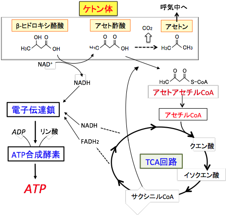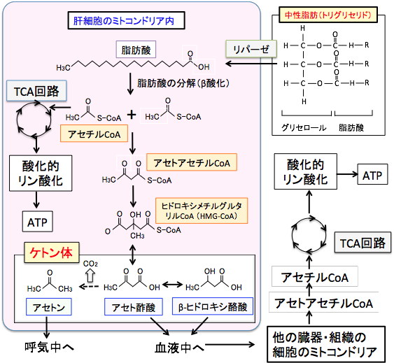 ブドウ糖が枯渇した状態で脂肪酸が燃焼するとき、肝臓ではケトン体(アセト酢酸とβ-ヒドロキシ酪酸)という物質ができます。このケトン体は脳にエネルギー源を供給するために肝臓で作られる物質です。