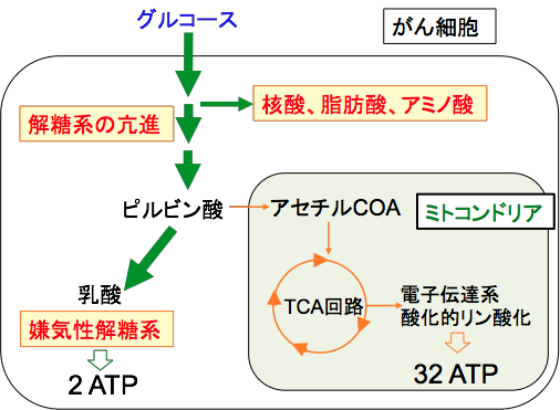 つまり、エネルギー産生と物質合成を増やすという2つの目的を両立させるために、必然的にミトコンドリアでの酸化的リン酸化が抑制され、解糖系に依存したエネルギー代謝が亢進し、グルコースの取込みが亢進していると考えられます。