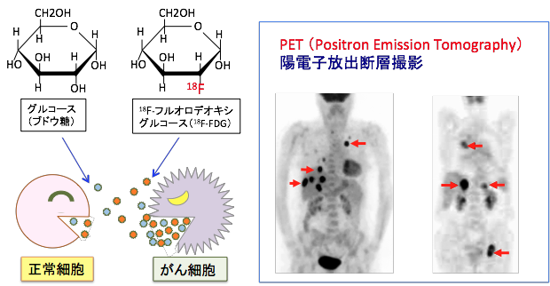がん細胞がグルコースの取込みが多いことはPET(Positron Emission Tomography:陽電子放射断層撮影)検査でも示されています。これはフッ素の同位体で標識したグルコース(18F-fluorodeoxy glucose)を注射して、この薬剤ががん組織に集まるところを画像化する検査法で、正常細胞に比べてグルコースの取り込みが非常に高いがん細胞の特性を利用した検査法です(下図)。
