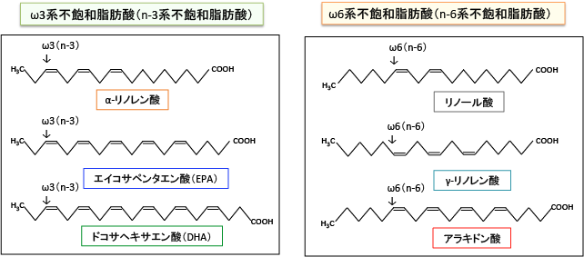 図:ω3系不飽和脂肪酸とω6系不飽和脂肪酸の化学構造。