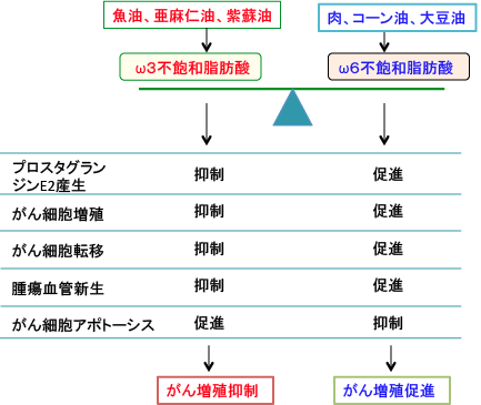 リノール酸やγ-リノレン酸やアラキドン酸のようなω6系不飽和脂肪酸を多く取り込んだがん細胞は増殖が早く転移しやすくなります。一方、魚油に多く含まれるドコサヘキサエン酸(DHA)やエイコサペンタエン酸(EPA)やα-リノレン酸のようなω3不飽和脂肪酸を多く取り込んだがん細胞は増殖が抑えられ、抗がん剤で死にやすくなります。ω6系不飽和脂肪酸は、がん細胞の増殖や血管新生を促進するプロスタグランジンE2の原料になり、ω3系不飽和脂肪酸はプロスタグランジンE2の産生を抑えることが関連しています。