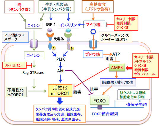 栄養をたくさん摂ると、その栄養ががん細胞にいって、かえってがん細胞の増殖を促進するということが言われています。それは、はっきりした根拠も証拠も無いのですが、ブドウ糖やタンパク質を多く摂取して栄養状態が良くなると、インスリン様成長因子やロイシンの作用でmTORC1が活性化されるという観点からは、この考えもあり得ることのように思います。